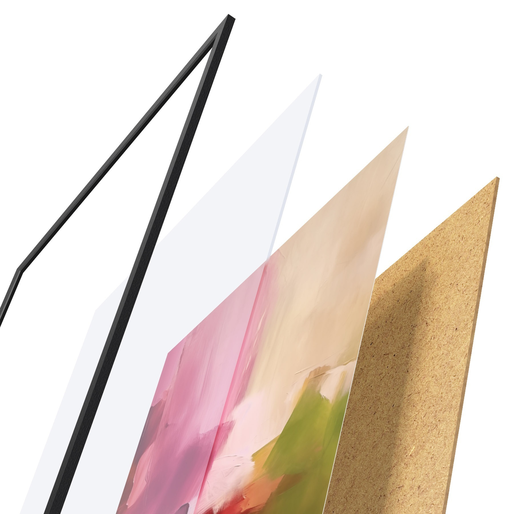 Plakatą sudaro rėmas, pleksiklas, atspausdintas vaizdas ir medžio drožlių plokštės pagrindas. Plakatą galima iš karto pakabinti ant sienos dėl kitoje pusėje esančių laikiklių.