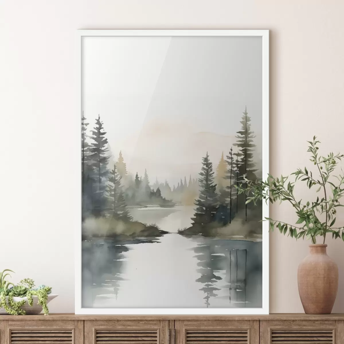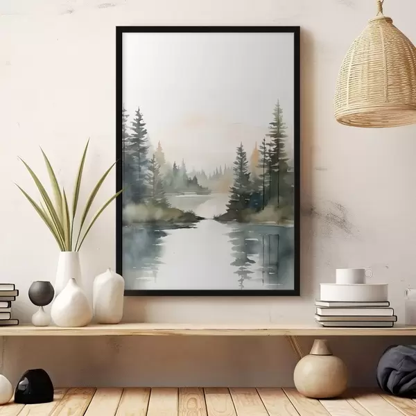 Plakatas Rūko apgaubtas spygliuočių miškas virš ramios upės, akvarelės stiliumi f46507
