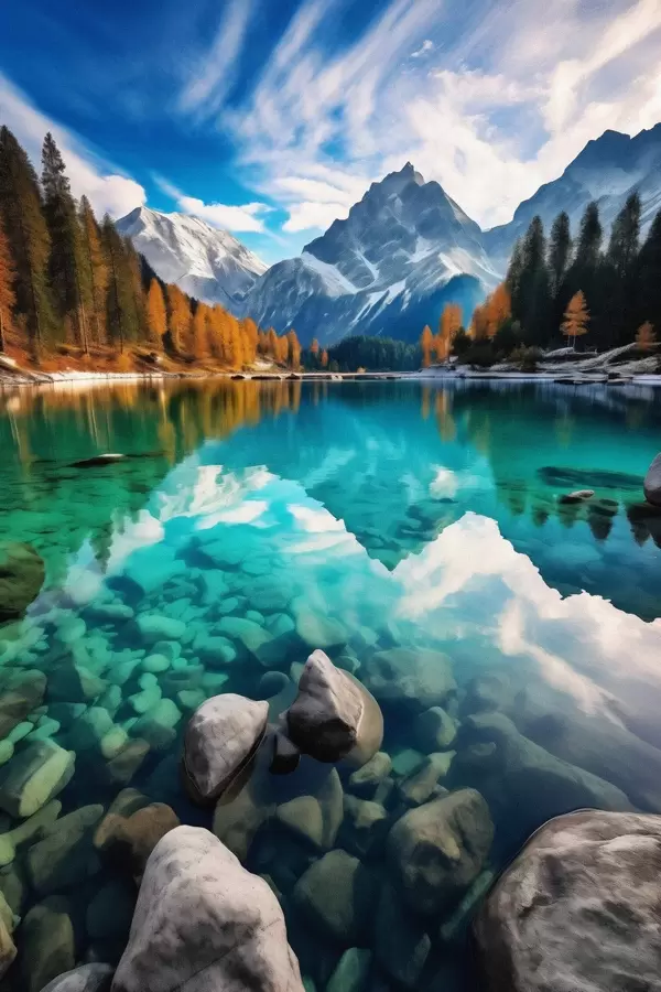 Plakatas Kalnų ežeras su turkio spalvos vandeniu ir rudens maumedžiais f46517