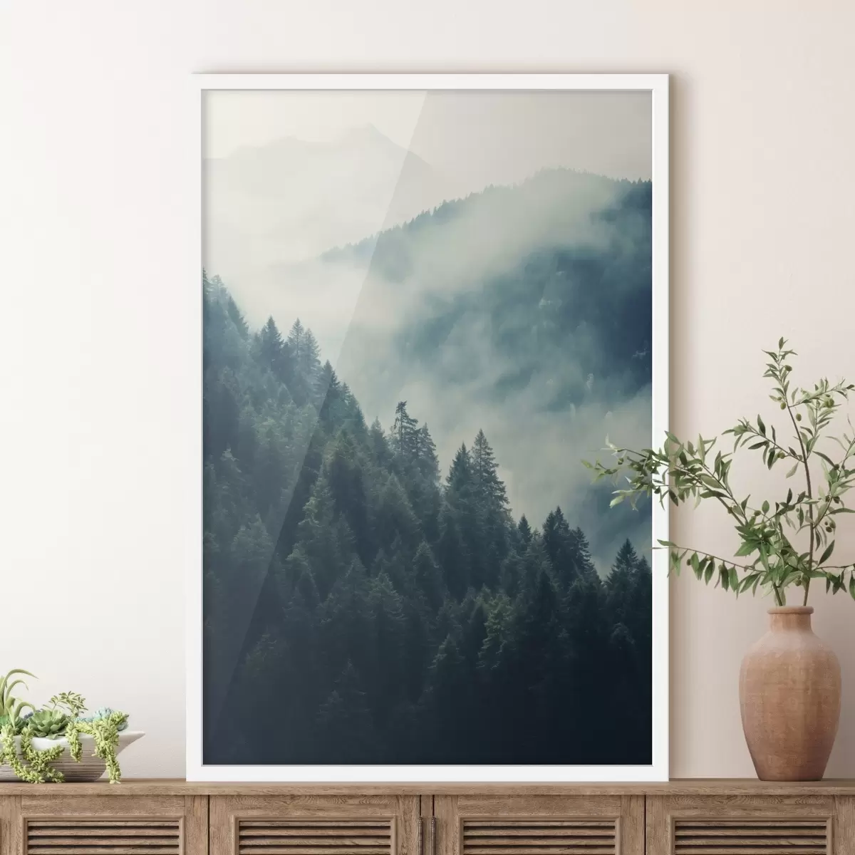 Plakatas Rūko apgaubti kalnų keteros ir tamsūs spygliuočių miškai Ne f46518