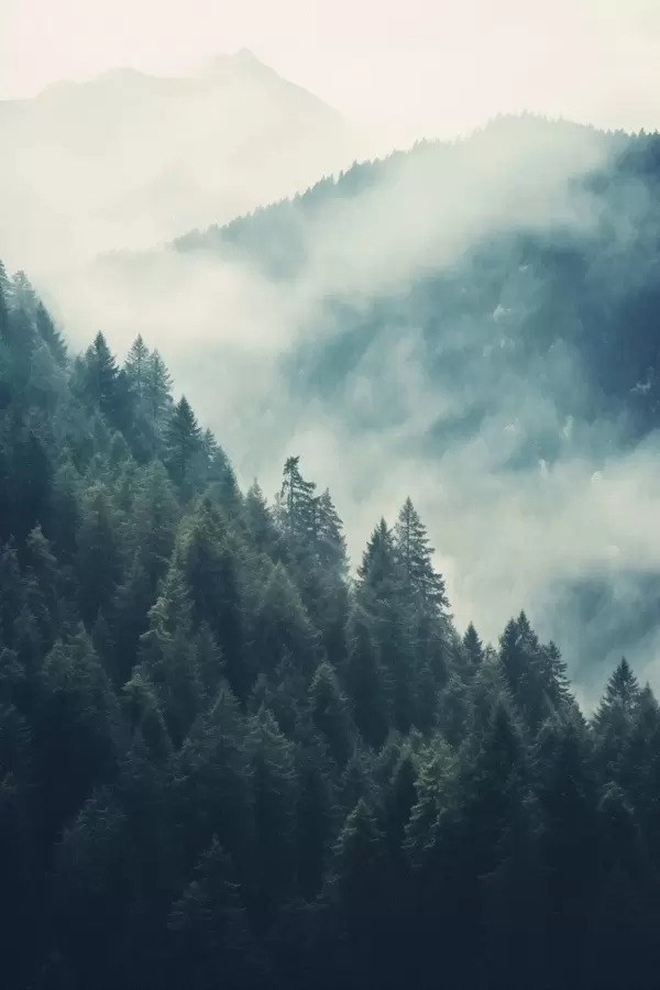 Plakatas Rūko apgaubti kalnų keteros ir tamsūs spygliuočių miškai Ne f46518
