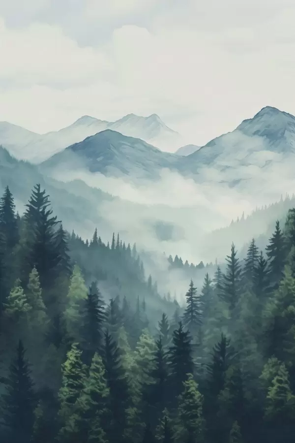 Plakatas Akvareliniai kalnai ir miškas švelniame rytiniame rūke f46519