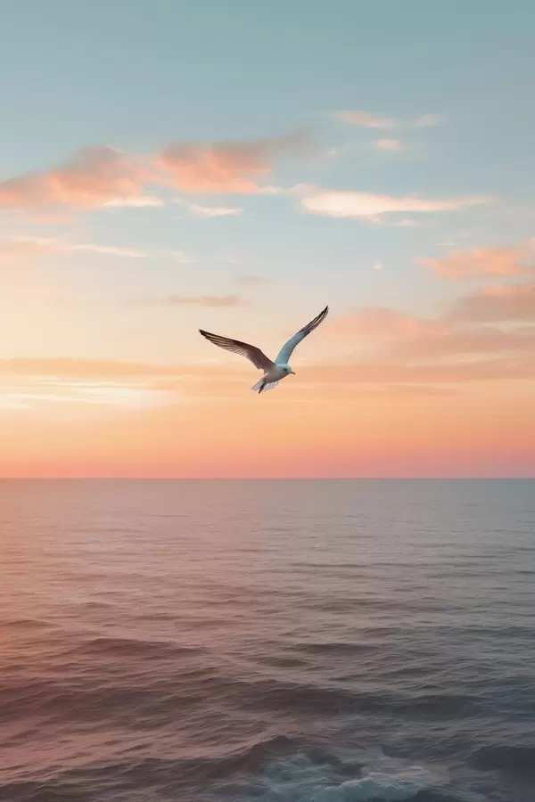 Plakatas Jūrinis paukštis virš jūros rausvai-persikų spalvos saulėlydžio fone f46520