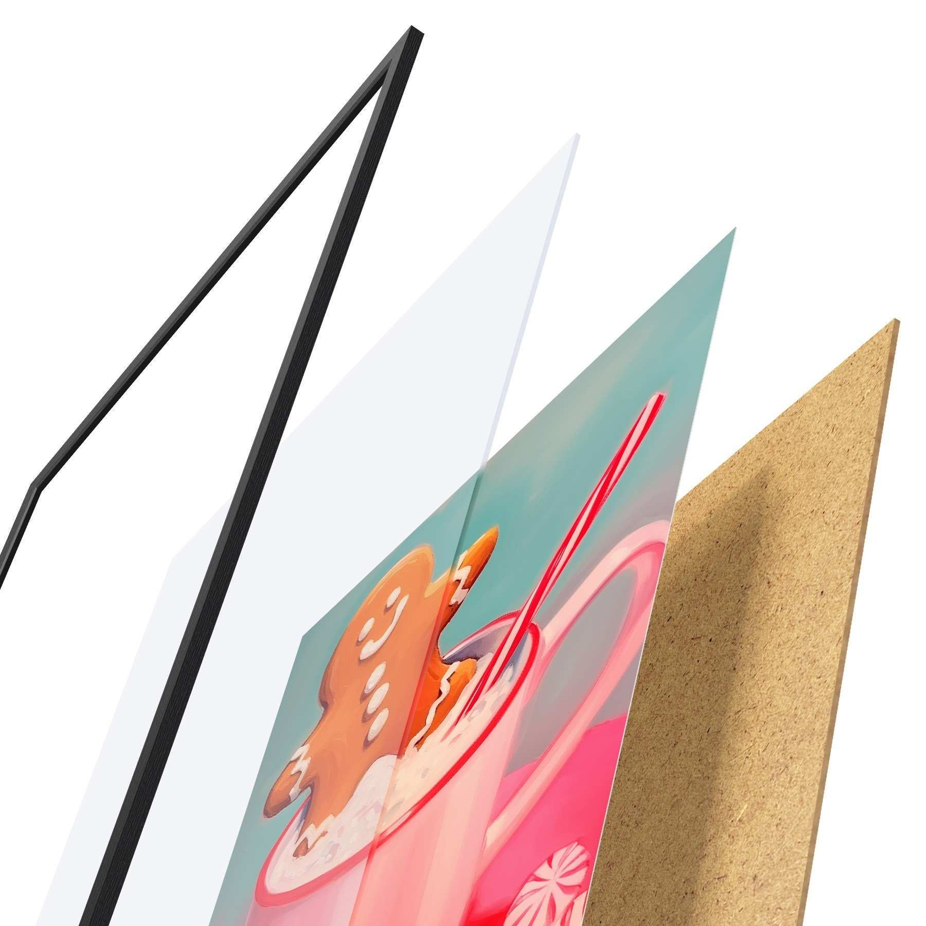 Plakatą sudaro rėmas, pleksiklas, atspausdintas vaizdas ir medžio drožlių plokštės pagrindas. Plakatą galima iš karto pakabinti ant sienos dėl kitoje pusėje esančių laikiklių.