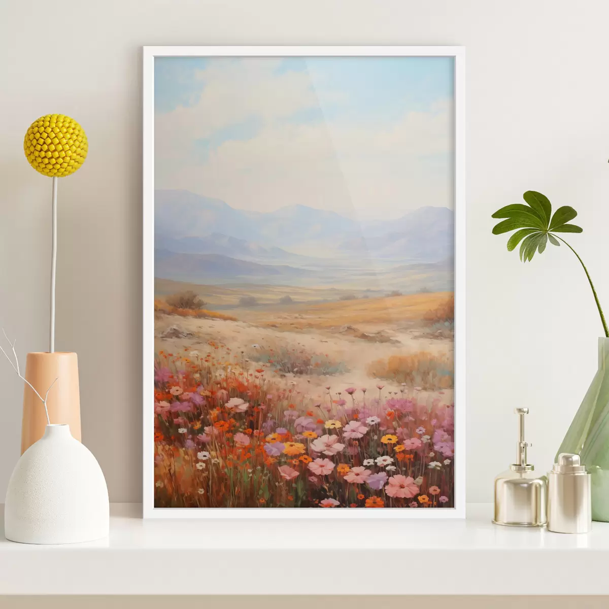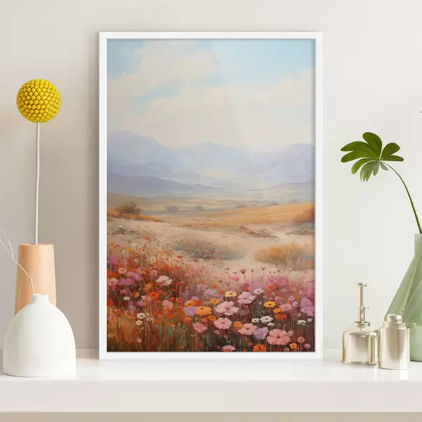 Plakatas Pejzažas, spalvingų gėlių laukas su kalnais fone, švelnios ir pastelinės spalvos Ne f46685