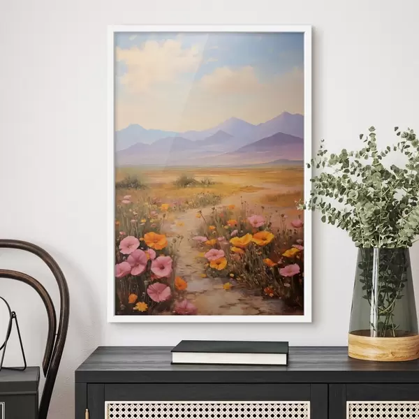 Plakatas Pejzažas, spalvingų gėlių laukas su kalnais fone, švelnios ir pastelinės spalvos Ne f46686