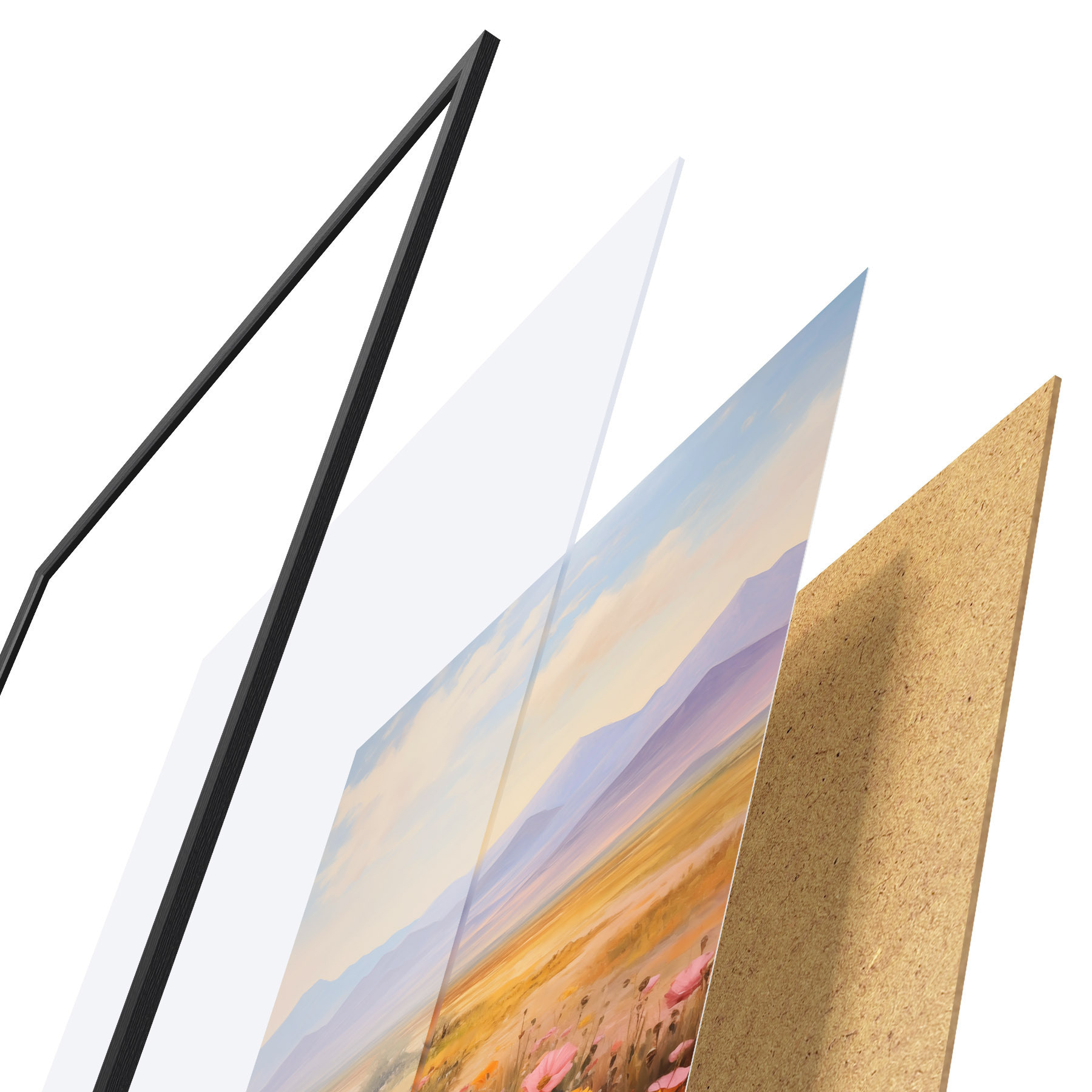 Plakatą sudaro rėmas, pleksiklas, atspausdintas vaizdas ir medžio drožlių plokštės pagrindas. Plakatą galima iš karto pakabinti ant sienos dėl kitoje pusėje esančių laikiklių.