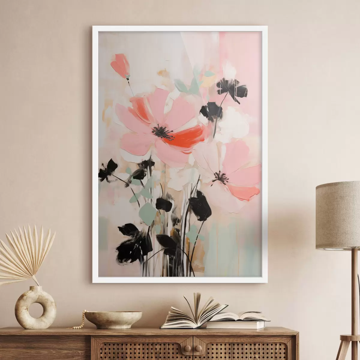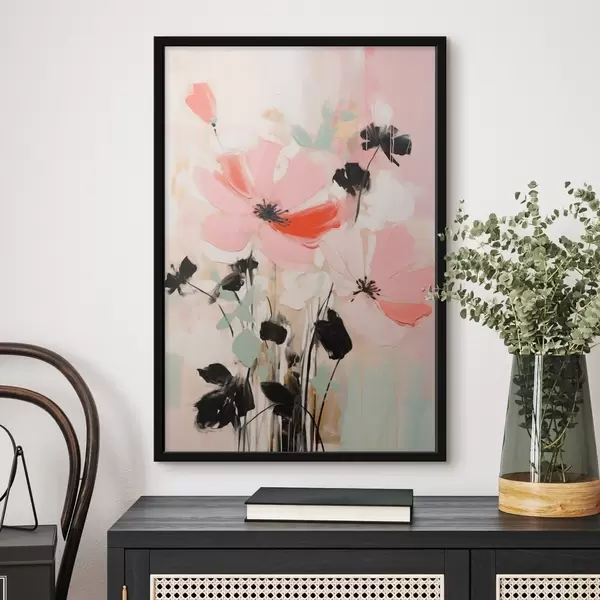 Plakatas Rožinės ir juodos gėlės su lapais, švelnios pastelinės spalvos, abstraktus gėlių kompozicija, minimalistinis menas Ne f46687