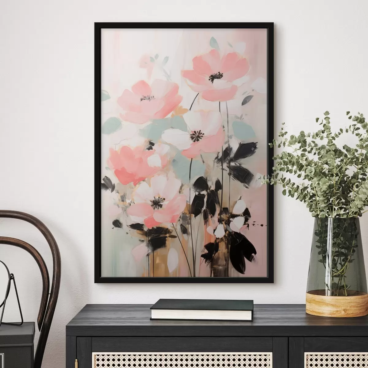 Plakatas Rožinės ir juodos gėlės su lapais, švelnios pastelinės spalvos, abstraktus gėlių kompozicija, minimalistinis menas Ne f46688