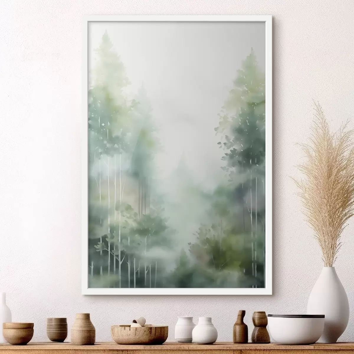 Plakatas Akvarelės tapybos imitacija abstraktaus miško su aukštais medžiais ir žaliais lapais, švelniomis prislopintomis spalvomis f46689