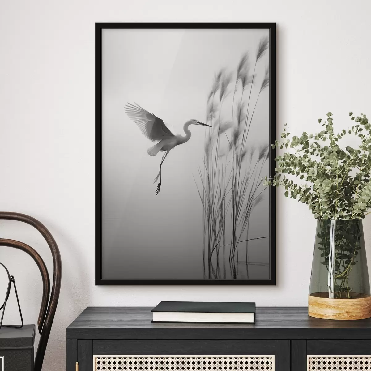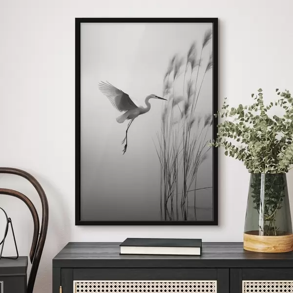 Plakatas Balta garza su išskleistais sparnais, skraidanti šalia aukštų nendrių, juodos ir baltos spalvų minimalistinė kompozicija f46693
