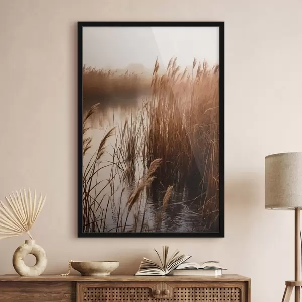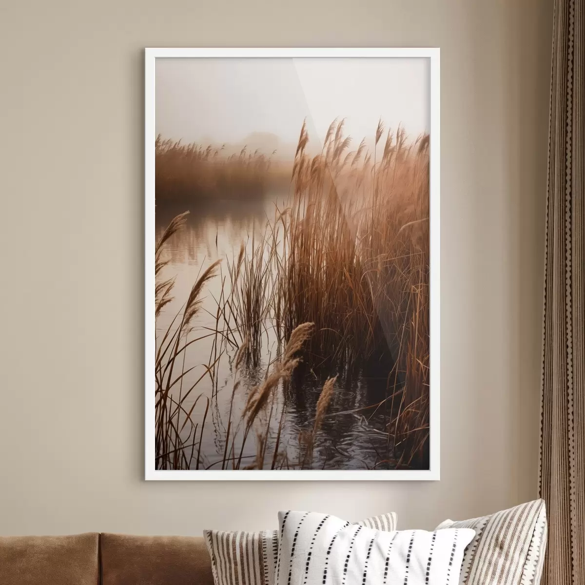 Plakatas Aukšti nendrės, augančios vandens telkinyje, vanduo atspindi nendres, rūko apgaubtas fonas, švelni šviesa, gamtos vaizdas f46695