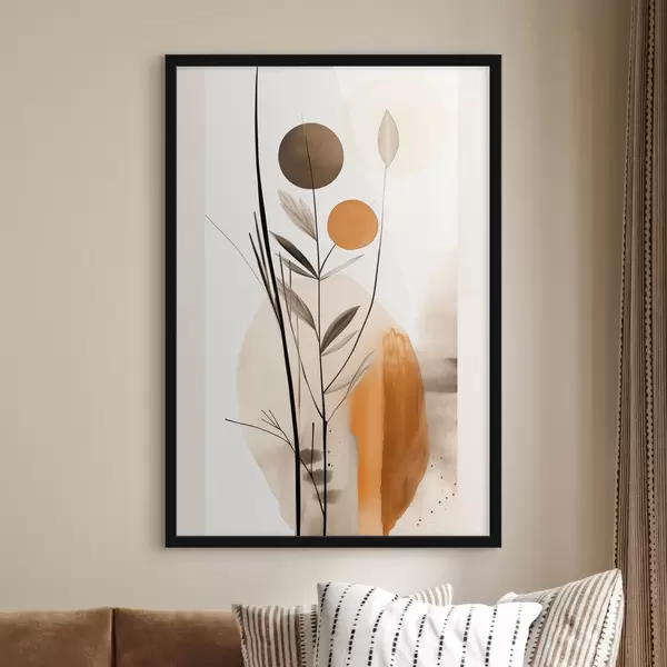 Plakatas Abstraktaus tapybos imitacija su oranžiniais ir pilkais apskritimais, lapais ir šakomis, modernus stilius, akvarelės efektas f46698