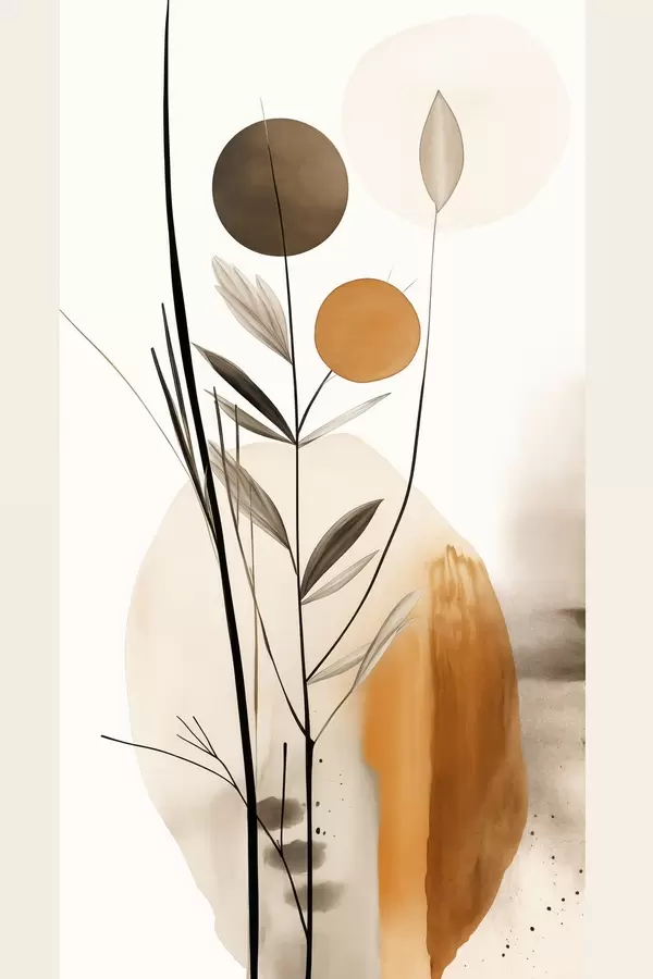 Plakatas Abstraktaus tapybos imitacija su oranžiniais ir pilkais apskritimais, lapais ir šakomis, modernus stilius, akvarelės efektas f46698