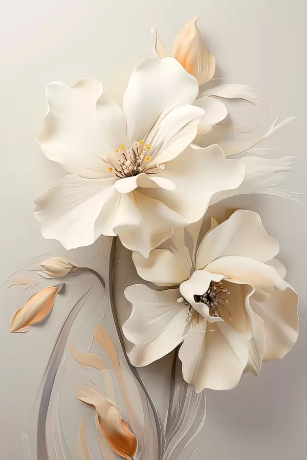 Plakatas Balta gėlė, švelnių atspalvių žiedlapiai, šviesiai smėlio spalvos fonas, elegantiška kompozicija, minimalistinis stilius f46700
