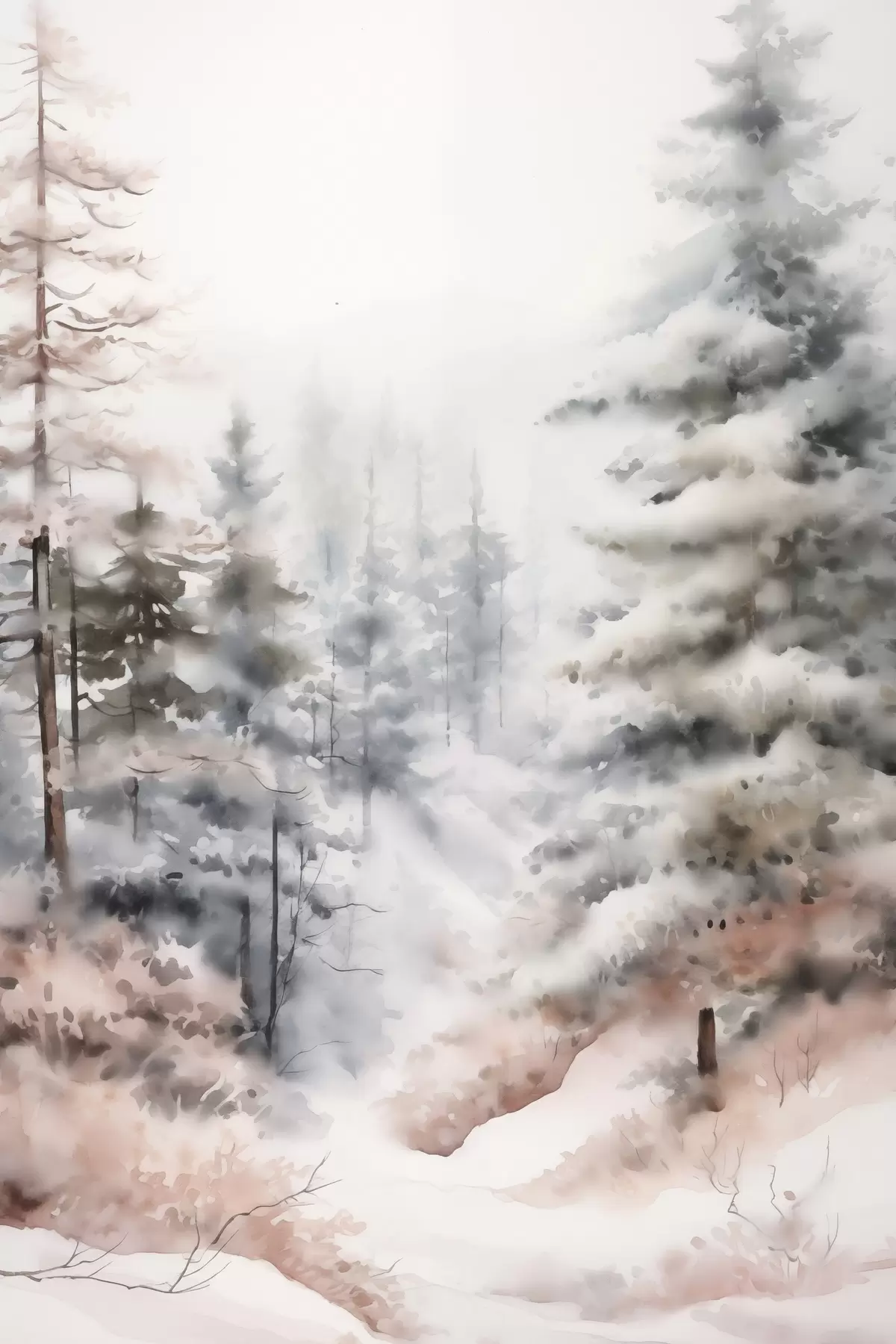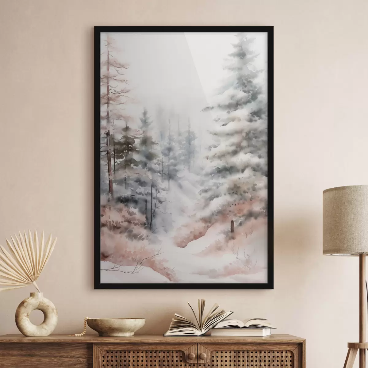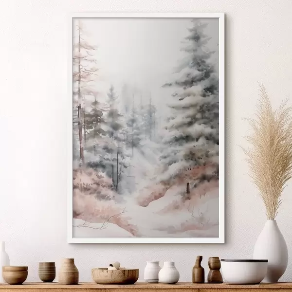 Plakatas Aukštos pušys, padengtos sniegu, stovinčios rūko apgaubtame miške, švelnus, tylus žiemos peizažas. f46702