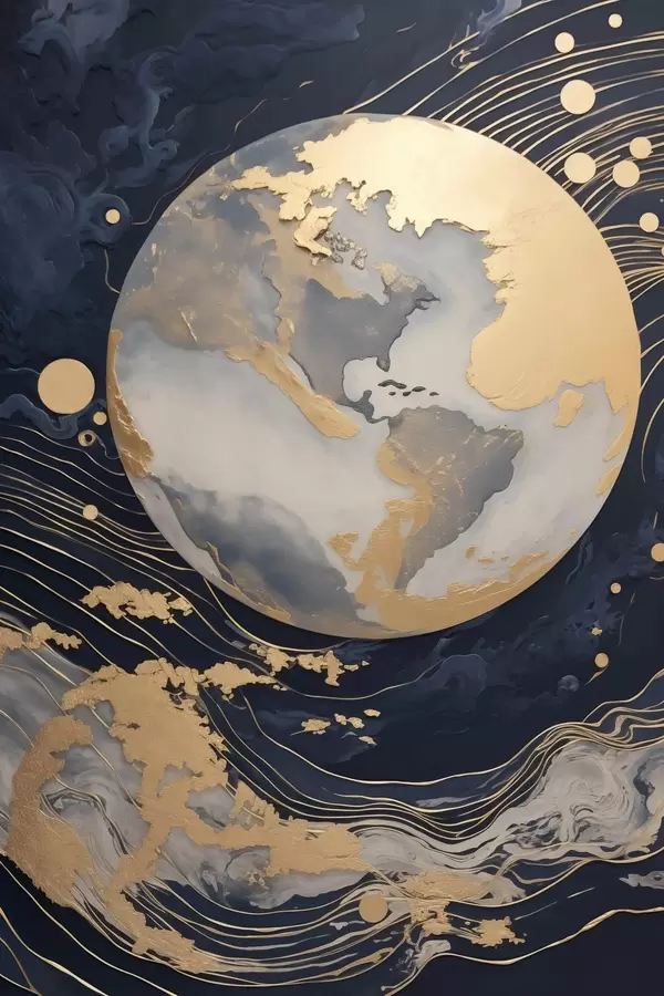 Plakatas Tekstūruota dekoratyvinė planeta su geltonomis linijomis fone, geltonomis taškeliais fone, tamsus fonas f46708