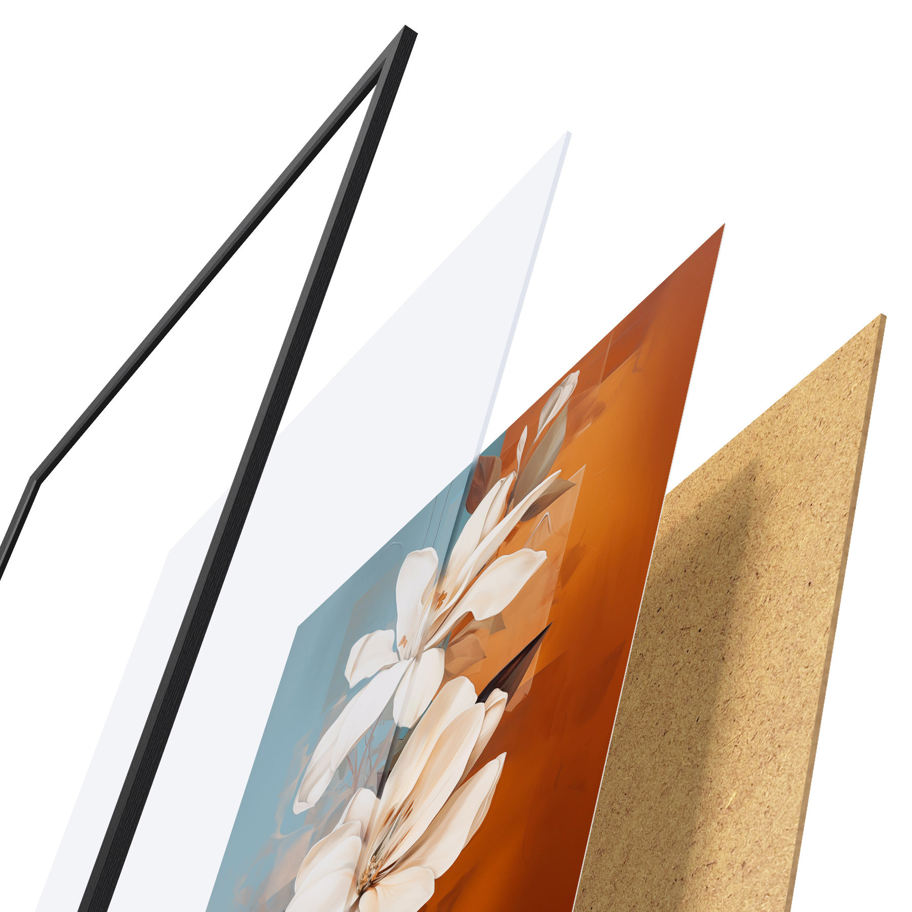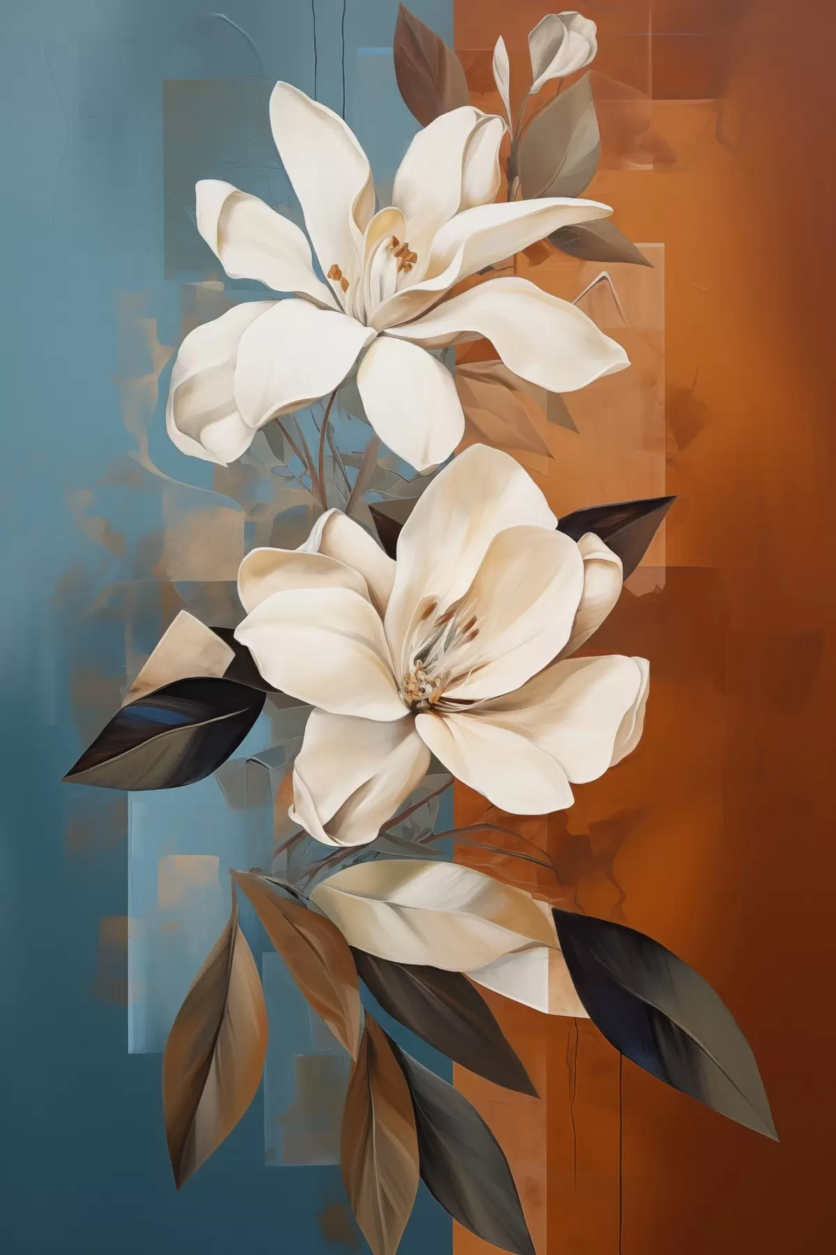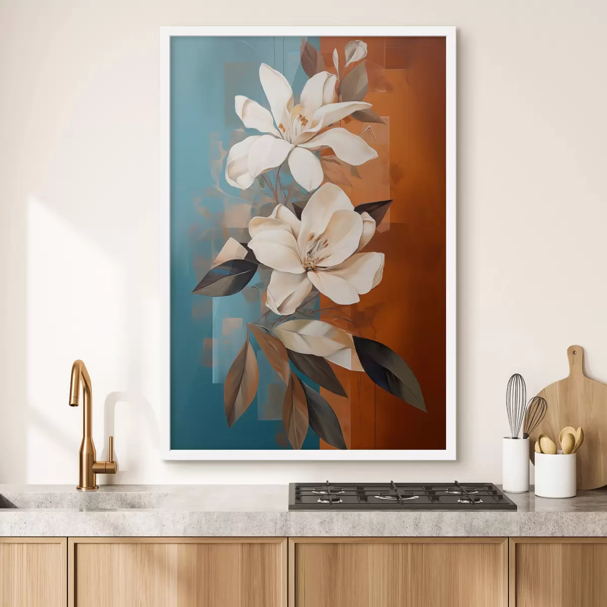 Plakatas Abstrakčios baltos gėlės ir lapai su rudos ir mėlynos spalvos fonu su abstrakčiomis formomis, minimalistiniu stiliumi. Ne f46710