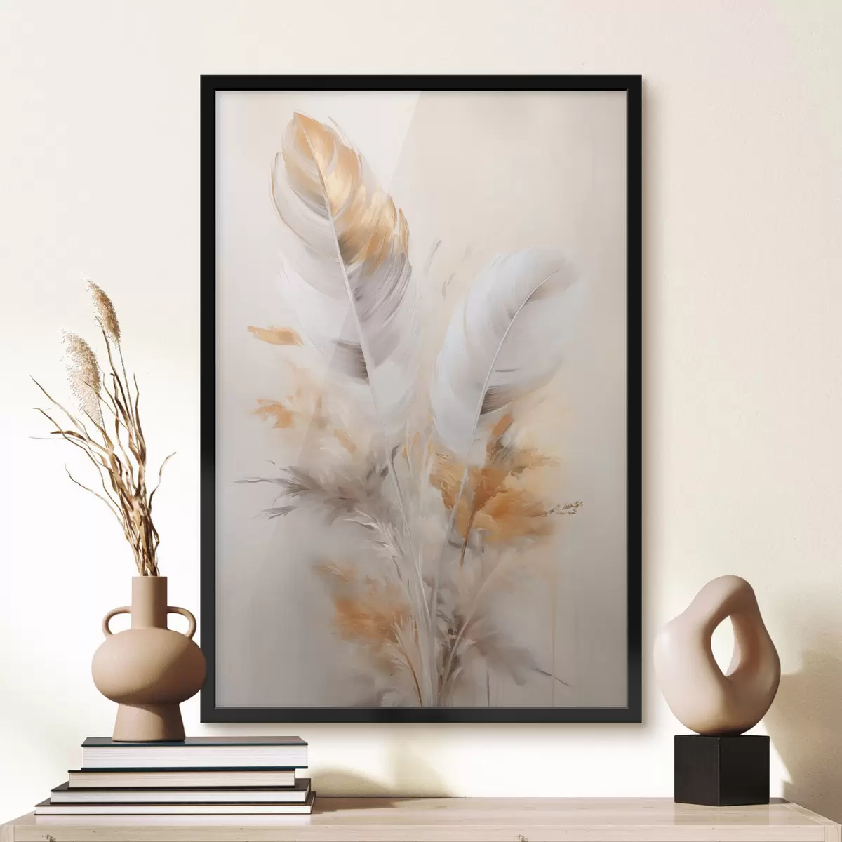 Plakatas Abstrakčios plunksnos, apsuptos smėlio ir rudos spalvos plunksnų, švelnios ir subtilios, ant šviesiai smėlio spalvos fono. Ne f46711