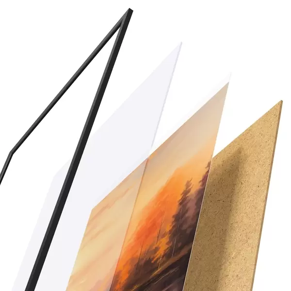 Plakatą sudaro rėmas, pleksiklas, atspausdintas vaizdas ir medžio drožlių plokštės pagrindas. Plakatą galima iš karto pakabinti ant sienos dėl kitoje pusėje esančių laikiklių.