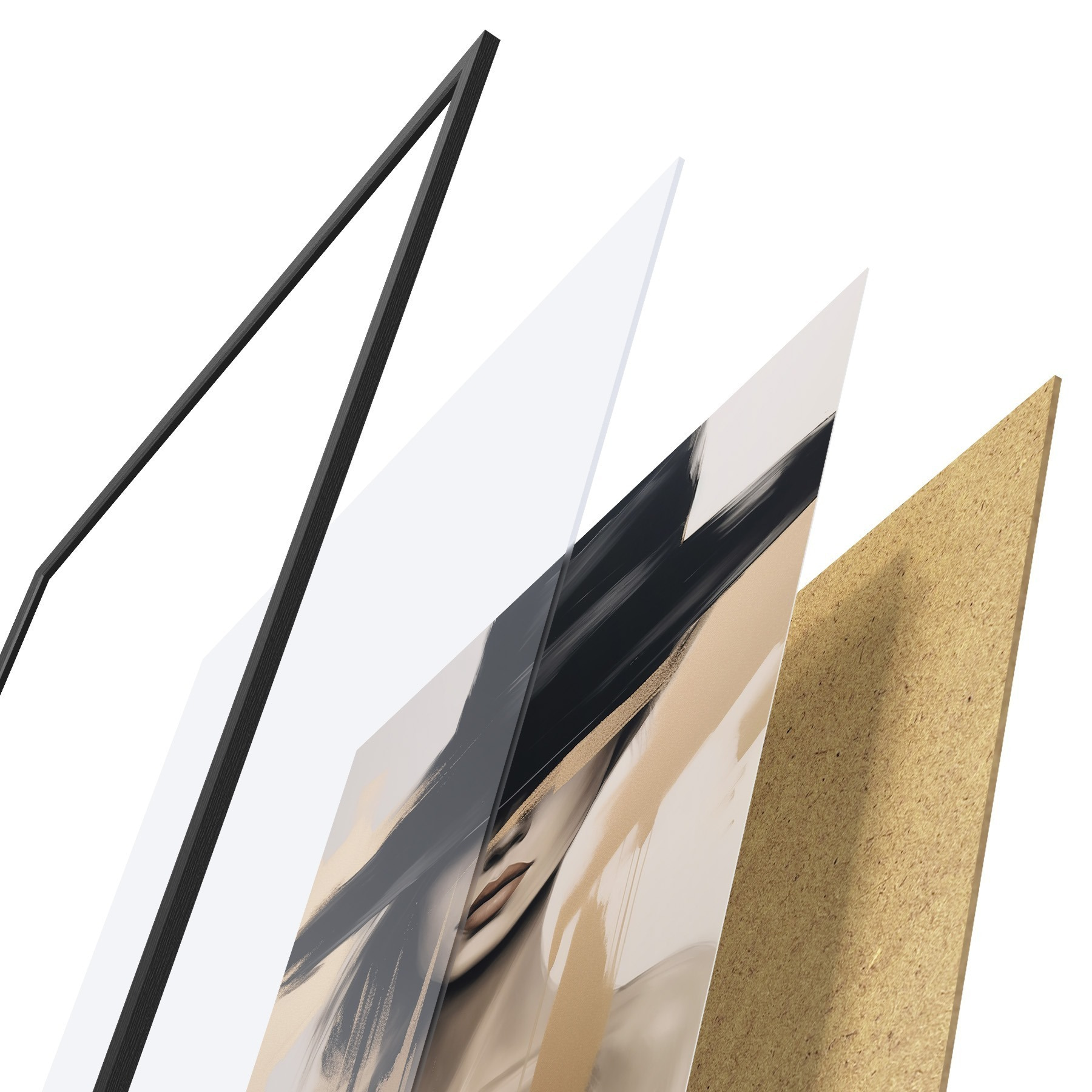 Plakatą sudaro rėmas, pleksiklas, atspausdintas vaizdas ir medžio drožlių plokštės pagrindas. Plakatą galima iš karto pakabinti ant sienos dėl kitoje pusėje esančių laikiklių.