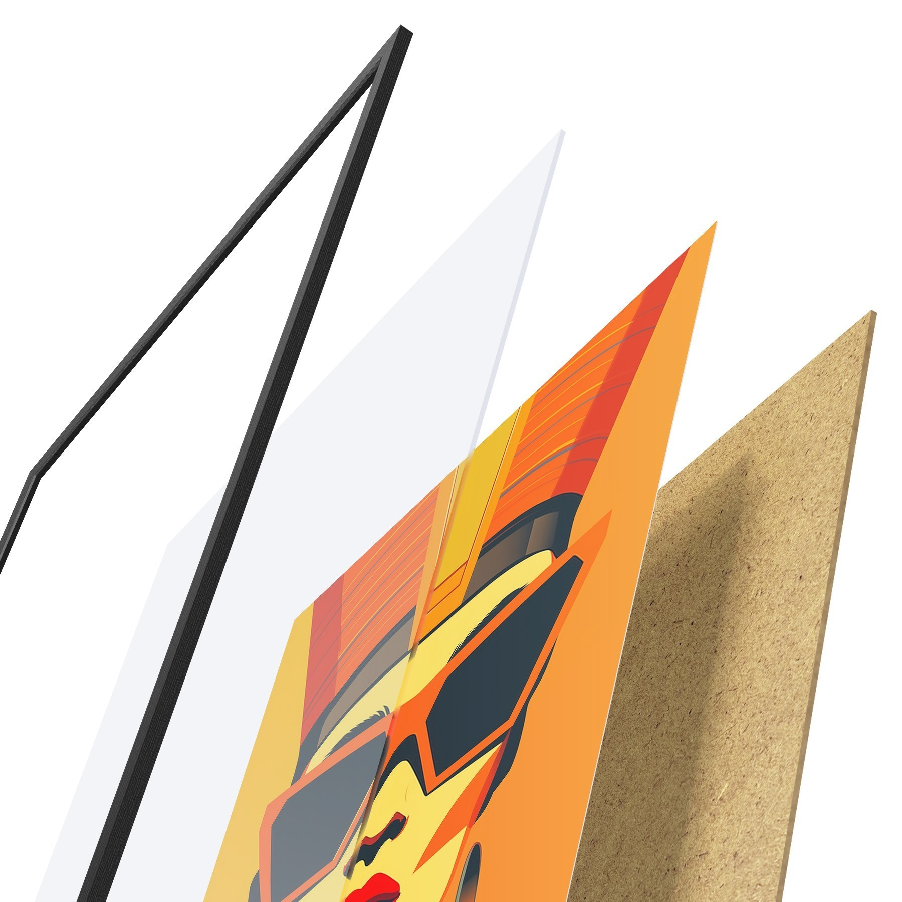 Plakatą sudaro rėmas, pleksiklas, atspausdintas vaizdas ir medžio drožlių plokštės pagrindas. Plakatą galima iš karto pakabinti ant sienos dėl kitoje pusėje esančių laikiklių.