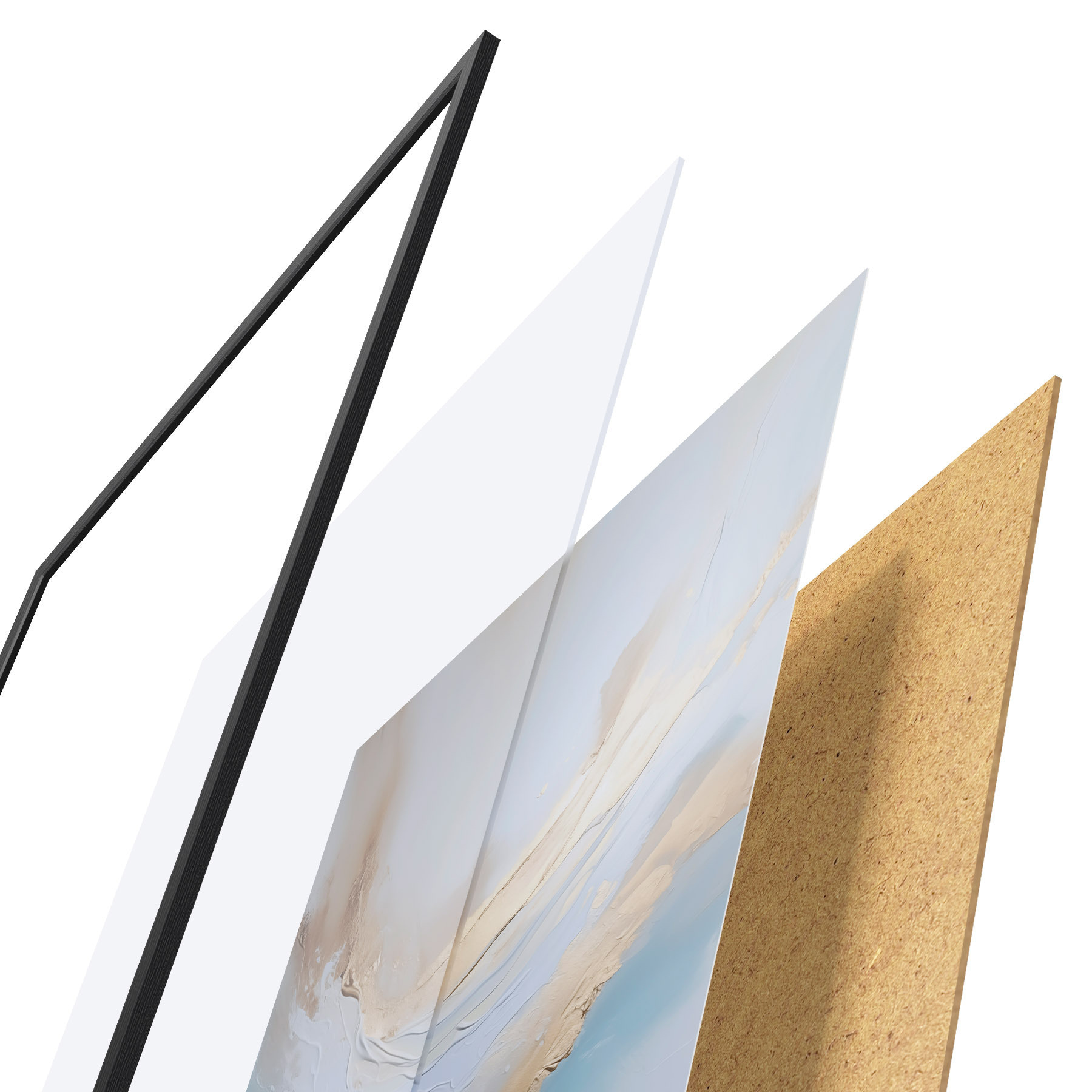 Plakatą sudaro rėmas, pleksiklas, atspausdintas vaizdas ir medžio drožlių plokštės pagrindas. Plakatą galima iš karto pakabinti ant sienos dėl kitoje pusėje esančių laikiklių.