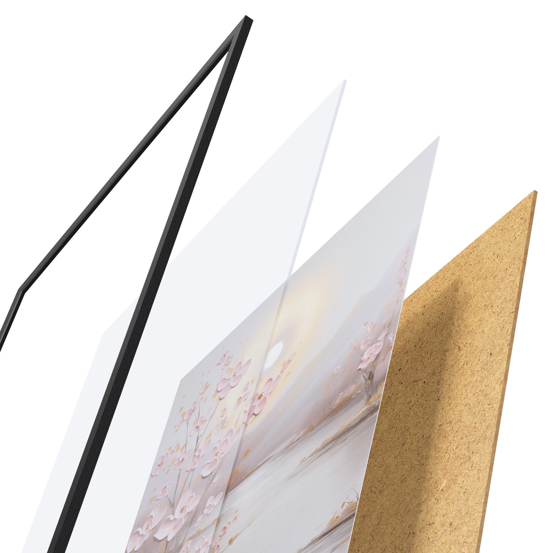 Plakatą sudaro rėmas, pleksiklas, atspausdintas vaizdas ir medžio drožlių plokštės pagrindas. Plakatą galima iš karto pakabinti ant sienos dėl kitoje pusėje esančių laikiklių.