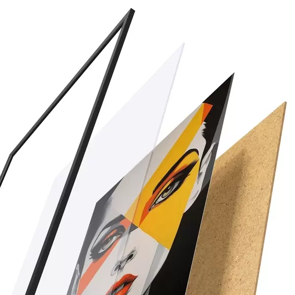 Plakatą sudaro rėmas, pleksiklas, atspausdintas vaizdas ir medžio drožlių plokštės pagrindas. Plakatą galima iš karto pakabinti ant sienos dėl kitoje pusėje esančių laikiklių.