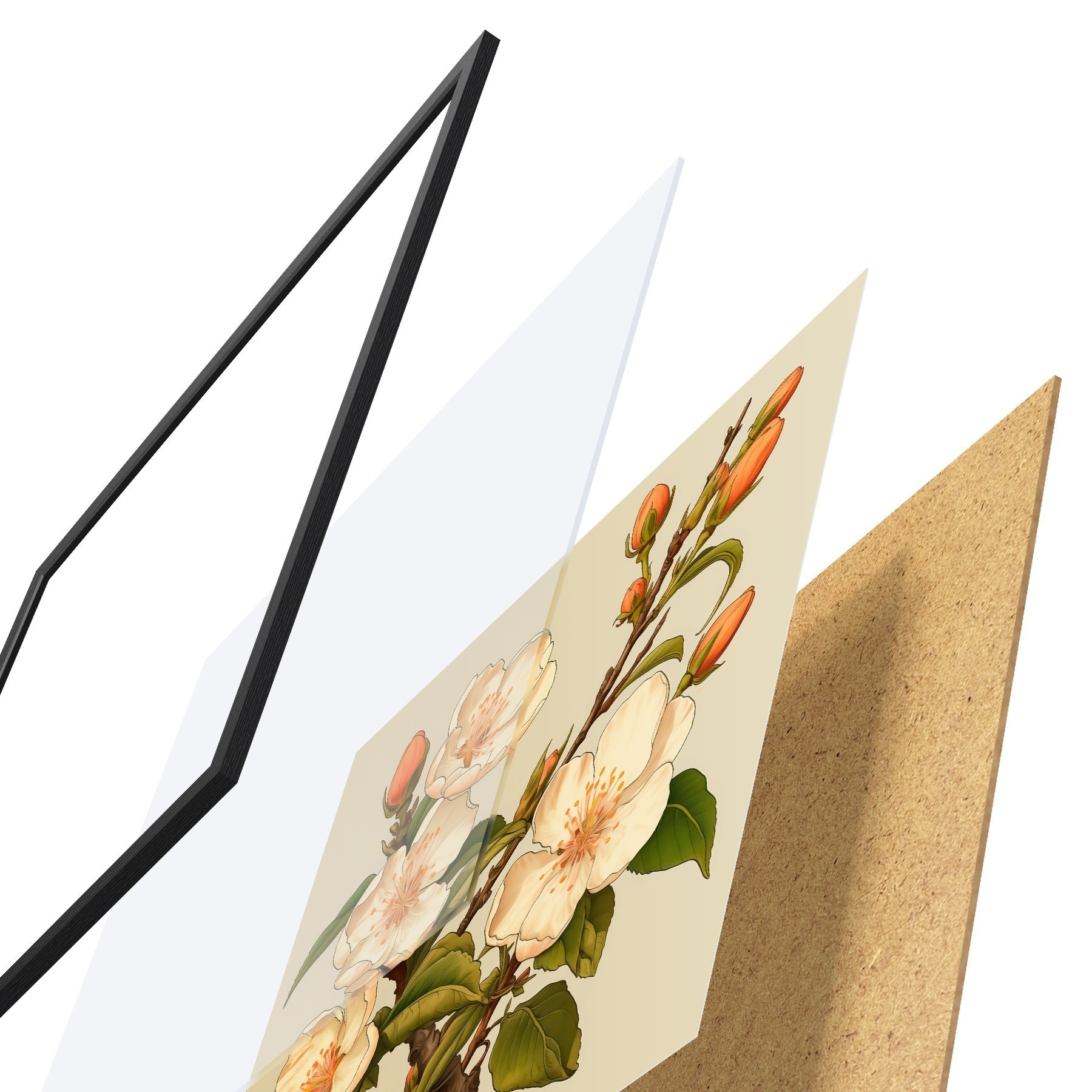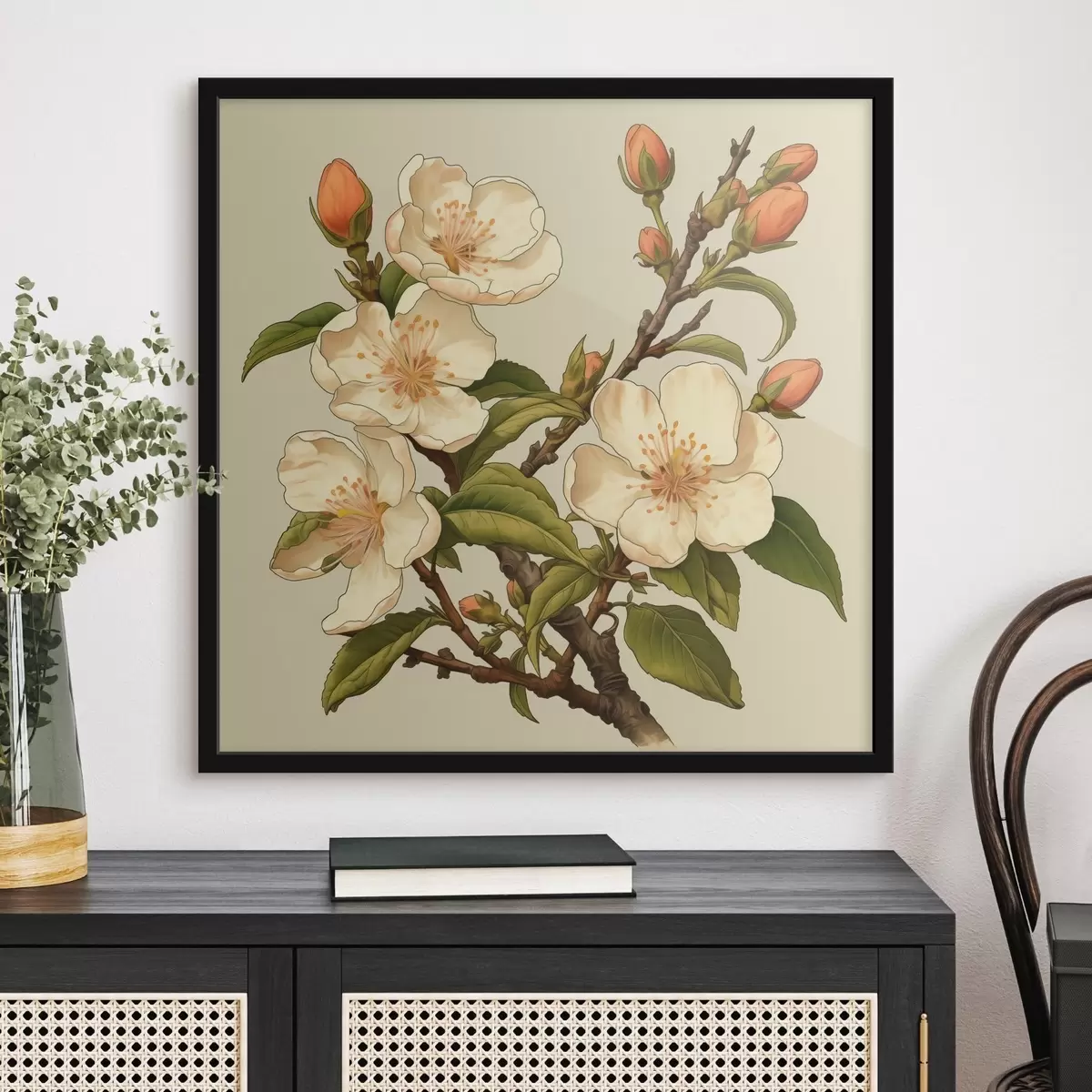Plakatas Žydinti šaka su baltais žiedais ant smėlio spalvos fono klasikinio stiliaus iliustracijoje f46923