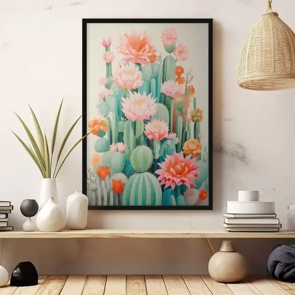Plakatas Žydintys kaktusai su rožiniais ir oranžiniais žiedais iliustracijos stiliumi f46934