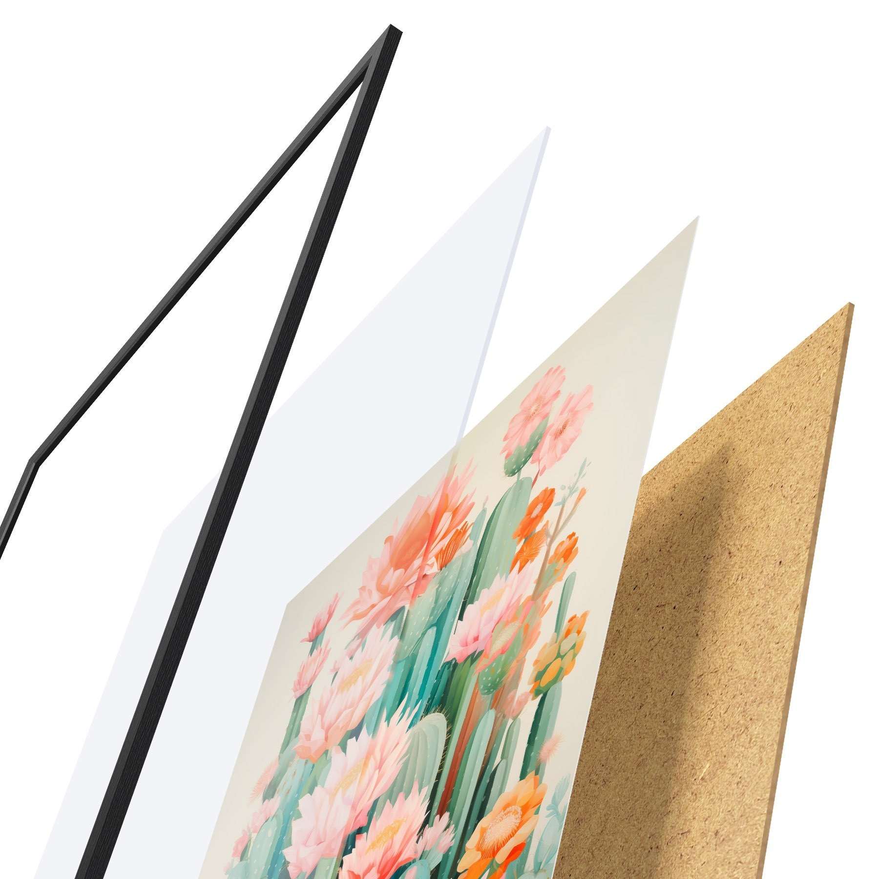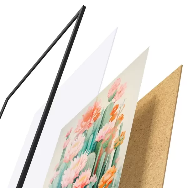 Plakatą sudaro rėmas, pleksiklas, atspausdintas vaizdas ir medžio drožlių plokštės pagrindas. Plakatą galima iš karto pakabinti ant sienos dėl kitoje pusėje esančių laikiklių.