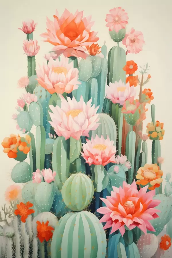 Plakatas Žydintys kaktusai su rožiniais ir oranžiniais žiedais iliustracijos stiliumi f46934