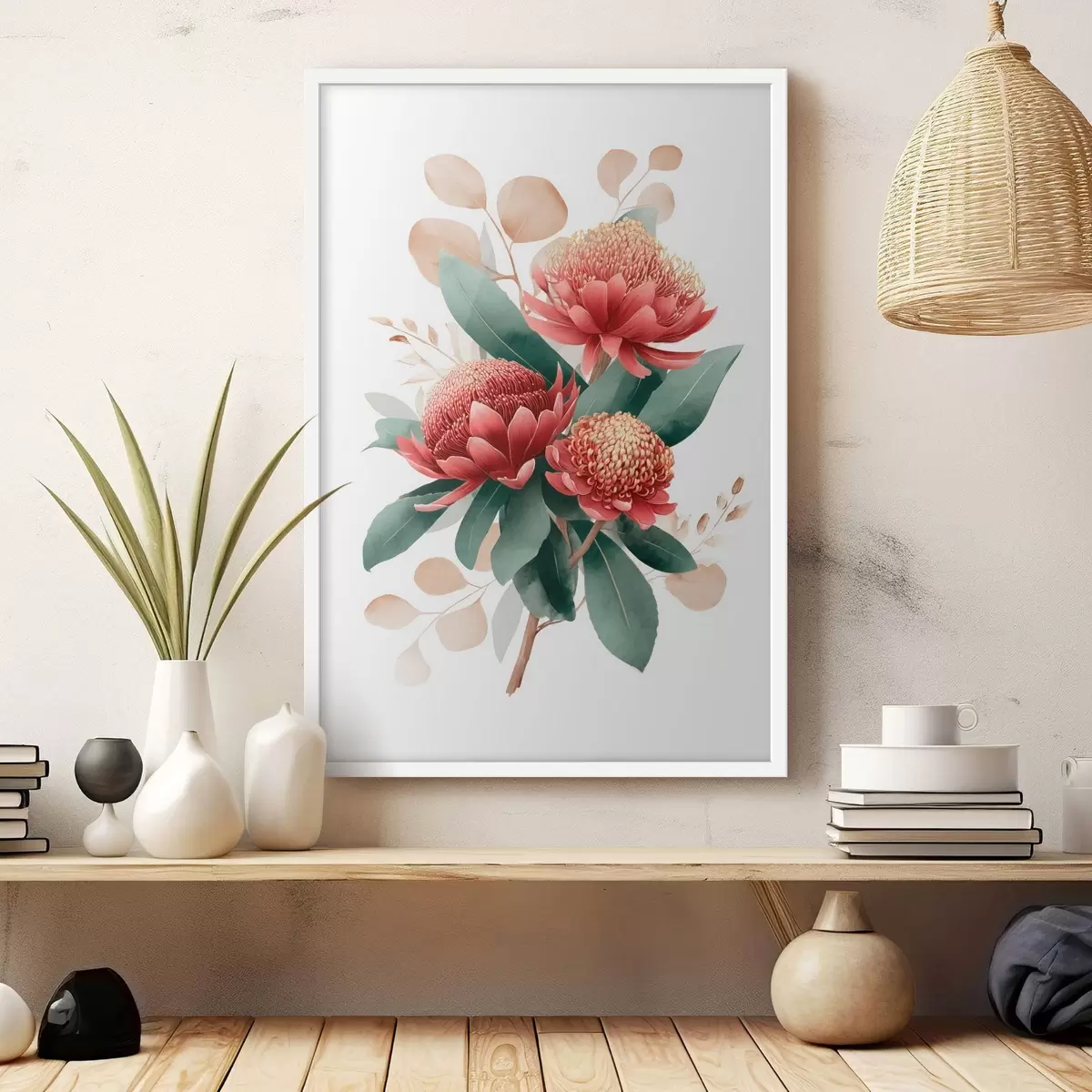 Plakatas Išraiškingas proteų ir dekoratyvinių lapų puokštė, sukurtas moderniosios meno iliustracijos stiliumi. f46954