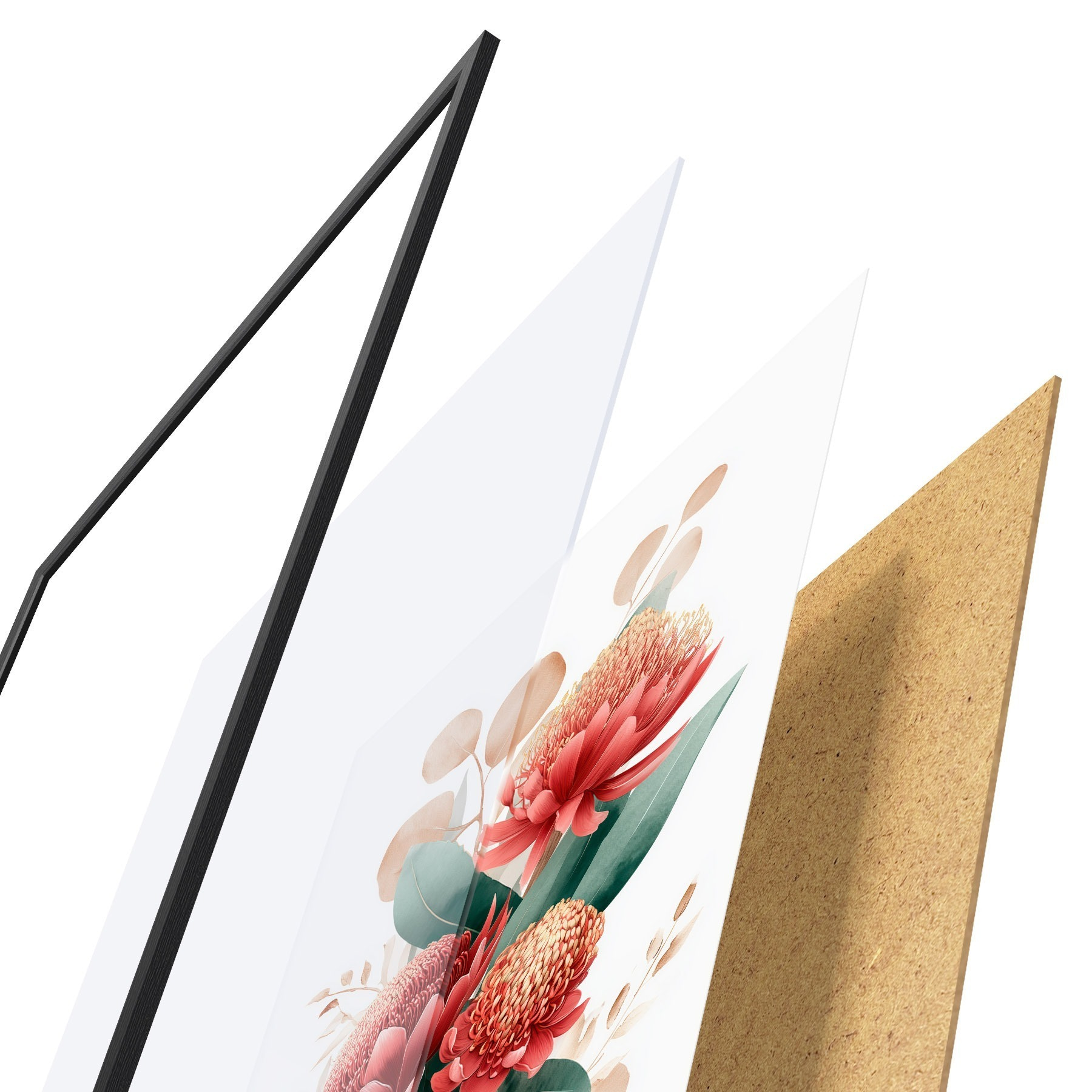 Plakatą sudaro rėmas, pleksiklas, atspausdintas vaizdas ir medžio drožlių plokštės pagrindas. Plakatą galima iš karto pakabinti ant sienos dėl kitoje pusėje esančių laikiklių.