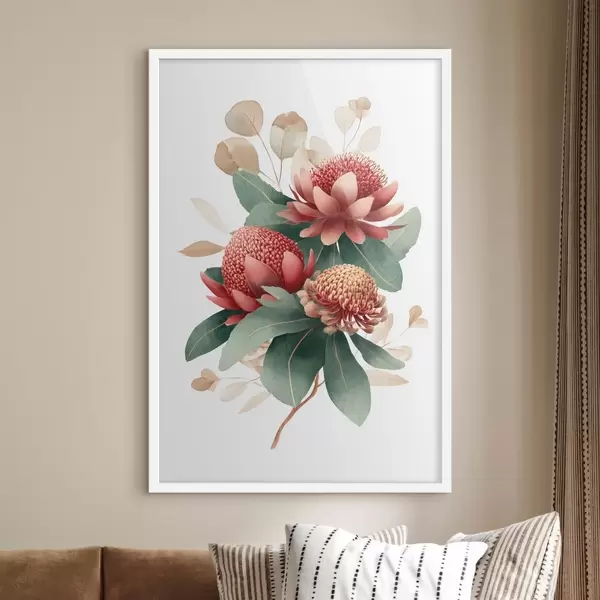Plakatas Gėlių kompozicija su didelėmis proteomis ir eukaliptais, atlikta moderniu skaitmeninio tapybos iliustracijos stiliumi. f46955