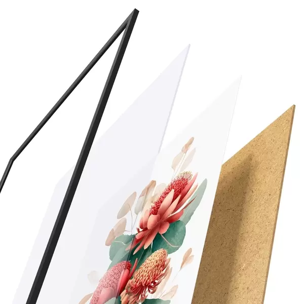 Plakatą sudaro rėmas, pleksiklas, atspausdintas vaizdas ir medžio drožlių plokštės pagrindas. Plakatą galima iš karto pakabinti ant sienos dėl kitoje pusėje esančių laikiklių.