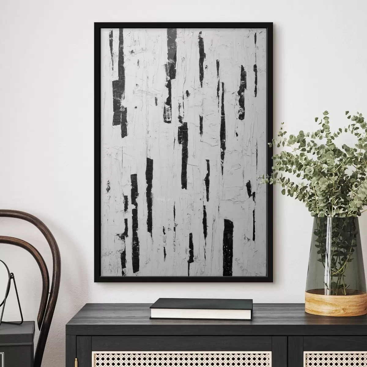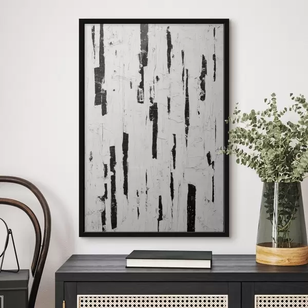Plakatas Abstrakčioji kompozicija su juodais vertikaliais potėpiais ant balto fono, tapyta aliejiniais dažais. Ne f46956