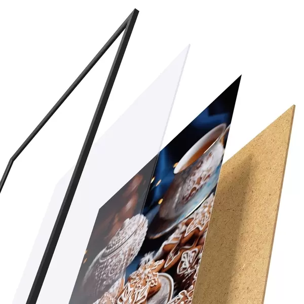 Plakatą sudaro rėmas, pleksiklas, atspausdintas vaizdas ir medžio drožlių plokštės pagrindas. Plakatą galima iš karto pakabinti ant sienos dėl kitoje pusėje esančių laikiklių.