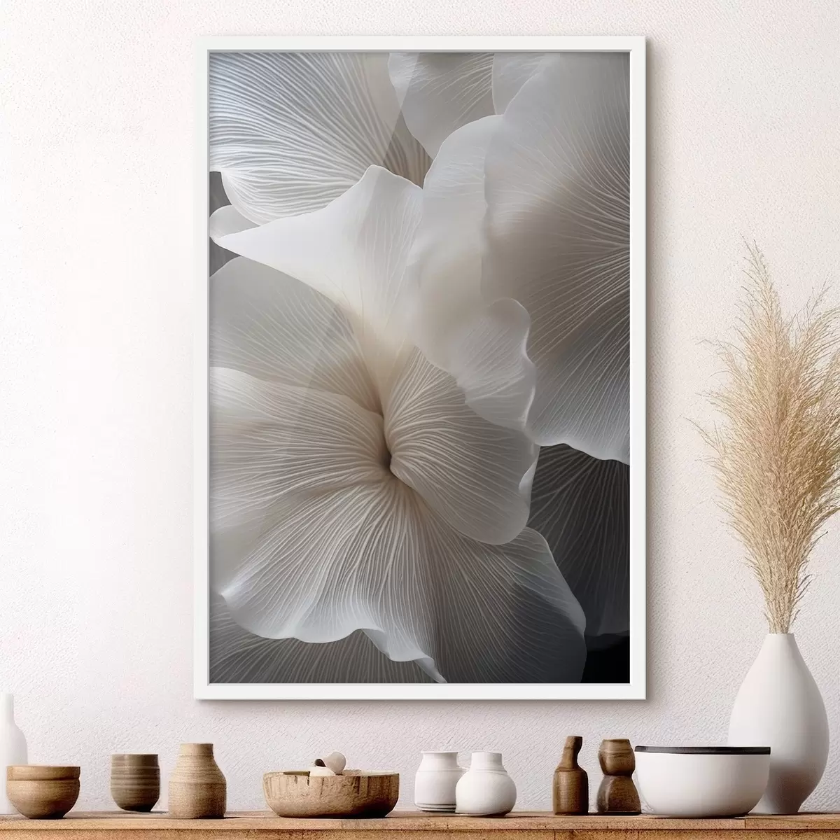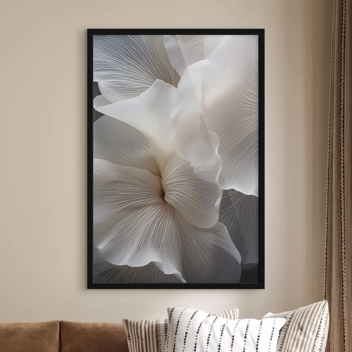 Plakatas Artimas vaizdas subtilaus abstraktaus balto gėlių žiedo su sudėtingomis linijomis ir neryškiu tamsiu fonu Ne f47019
