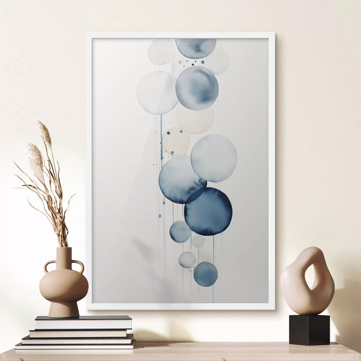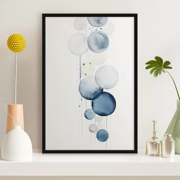 Plakatas Abstrakčios tekstūros mėlynos ir baltos akvarelės apskritimai įvairių dydžių, ant balto fono f47020