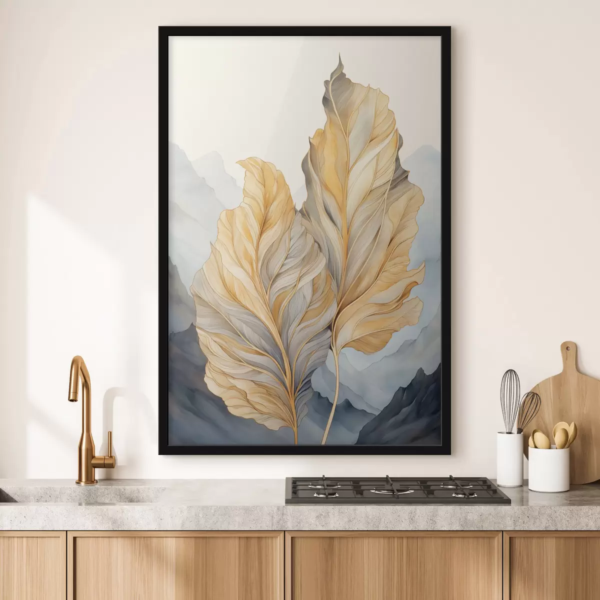 Plakatas Abstrakčios didelės, geltonos ir rudos spalvos lapai su sudėtingais detalėmis, kalnų peizažo fone f47023