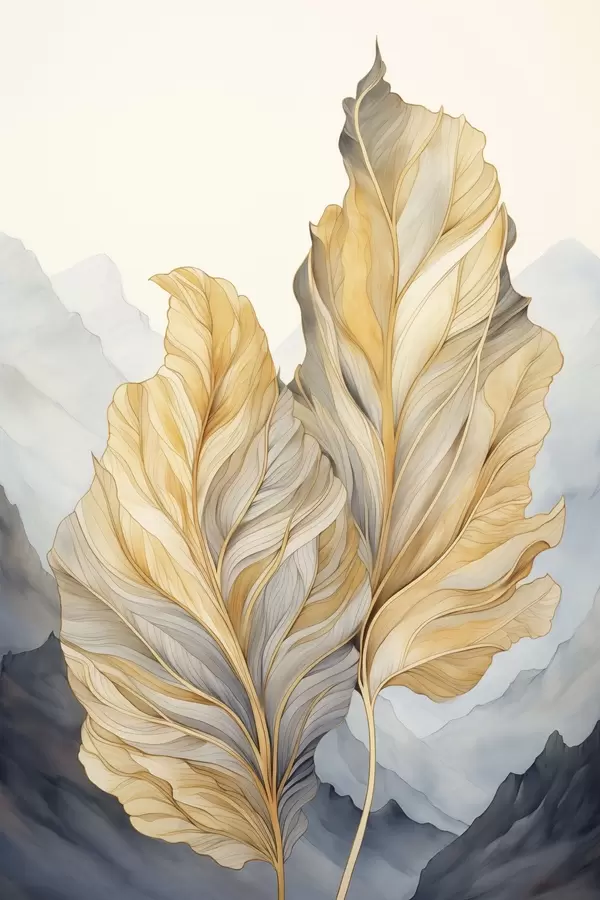Plakatas Abstrakčios didelės, geltonos ir rudos spalvos lapai su sudėtingais detalėmis, kalnų peizažo fone f47023