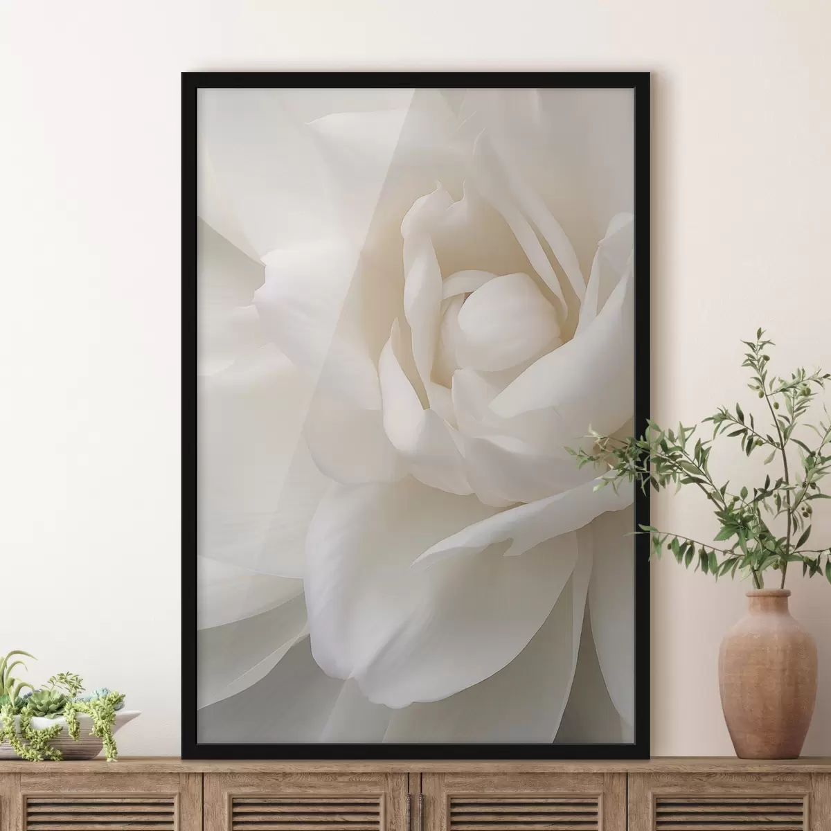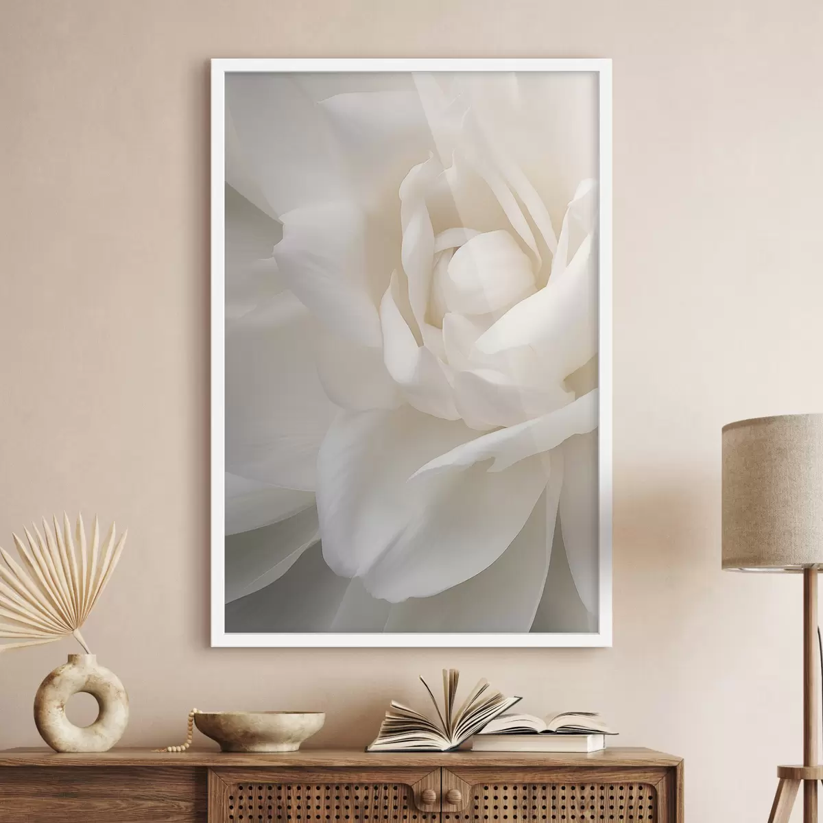 Plakatas Abstraktaus balto gėlės su subtiliais, sluoksniais susidėvėjusiais žiedlapiais, minimalistinis menas Ne f47025