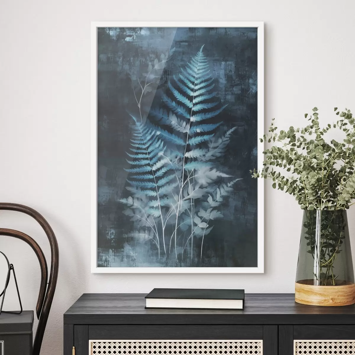 Plakatas Mėlyni paparčiai ir augalai prieš tamsų, tekstūruotą foną, akcentuojant sudėtingas detales, rentgeno efektas f47026