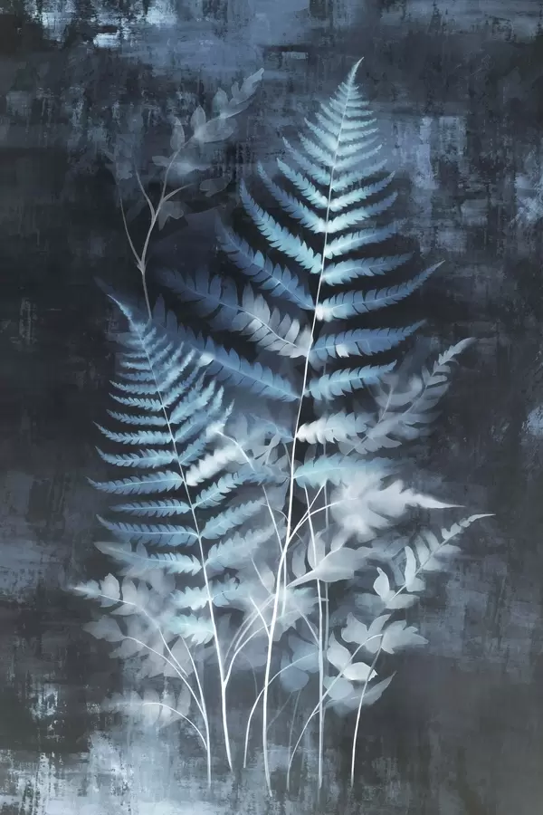 Plakatas Mėlyni paparčiai ir augalai prieš tamsų, tekstūruotą foną, akcentuojant sudėtingas detales, rentgeno efektas f47026