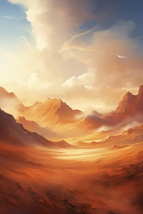 Plakatas Platus, oranžinis dykumos kraštovaizdis su aukštomis, uolėtomis kalnų viršūnėmis po miglotu, saulės apšviestu dangumi su plonais debesimis Ne f47028