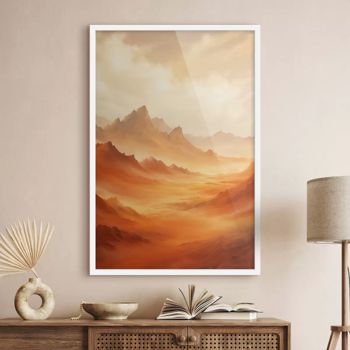 Plakatas Platus, oranžinis dykumos kraštovaizdis su aukštomis, uolėtomis kalnų viršūnėmis po miglotu, saulės apšviestu dangumi su plonais debesimis. f47029