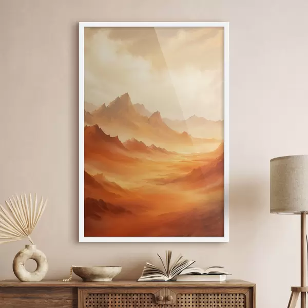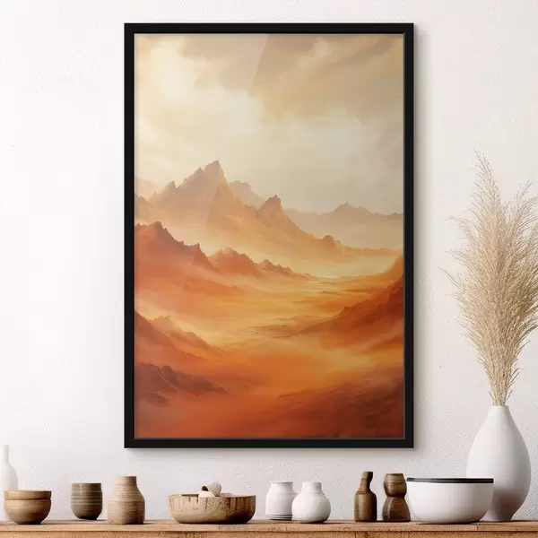 Plakatas Platus, oranžinis dykumos kraštovaizdis su aukštomis, uolėtomis kalnų viršūnėmis po miglotu, saulės apšviestu dangumi su plonais debesimis. Ne f47029