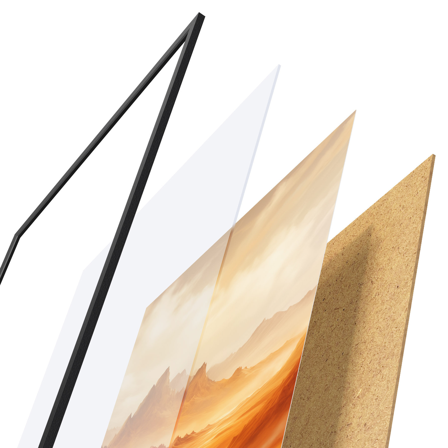 Plakatą sudaro rėmas, pleksiklas, atspausdintas vaizdas ir medžio drožlių plokštės pagrindas. Plakatą galima iš karto pakabinti ant sienos dėl kitoje pusėje esančių laikiklių.